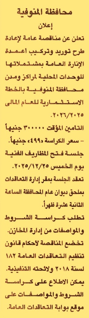 local_title: توريد وتركيب أعمدة الإنارة العامة ومكوناتها للوحدات المحلية في مراكز ومدن المحافظة